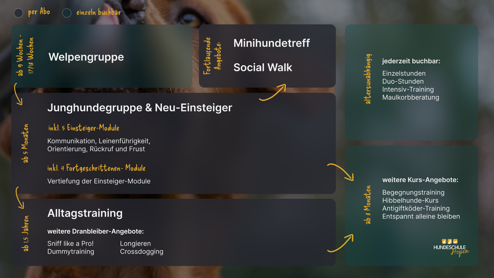 Individuelle Betreuung für jeden Hund – vom Welpen bis zum Senior! Wir kümmern uns einfühlsam und professionell um Eure Sorgen und Bedürfnisse – ganz gleich ob verspielter Familienhund, aufgedrehter Jungspund oder sensibler „special“-Hund.